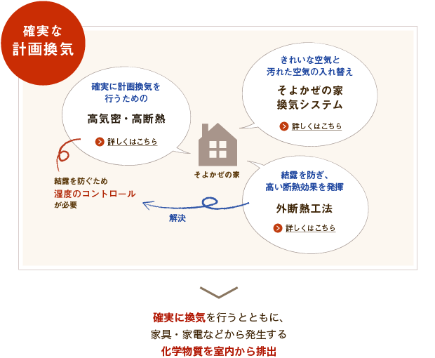 このように「そよかぜの家」は、24時間健康で快適な、きれいな空気の中で過ごすことのできる「確実な計画換気」を採用しています。