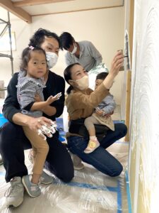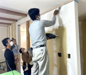 職人さんにレクチャーしてもらいながら、実際に自分たちの住む家の壁に漆喰を塗ってもらいます。