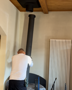 ストーブまわりを養生してから煙突を取り外し、専用のブラシですすや汚れを落としていきました。