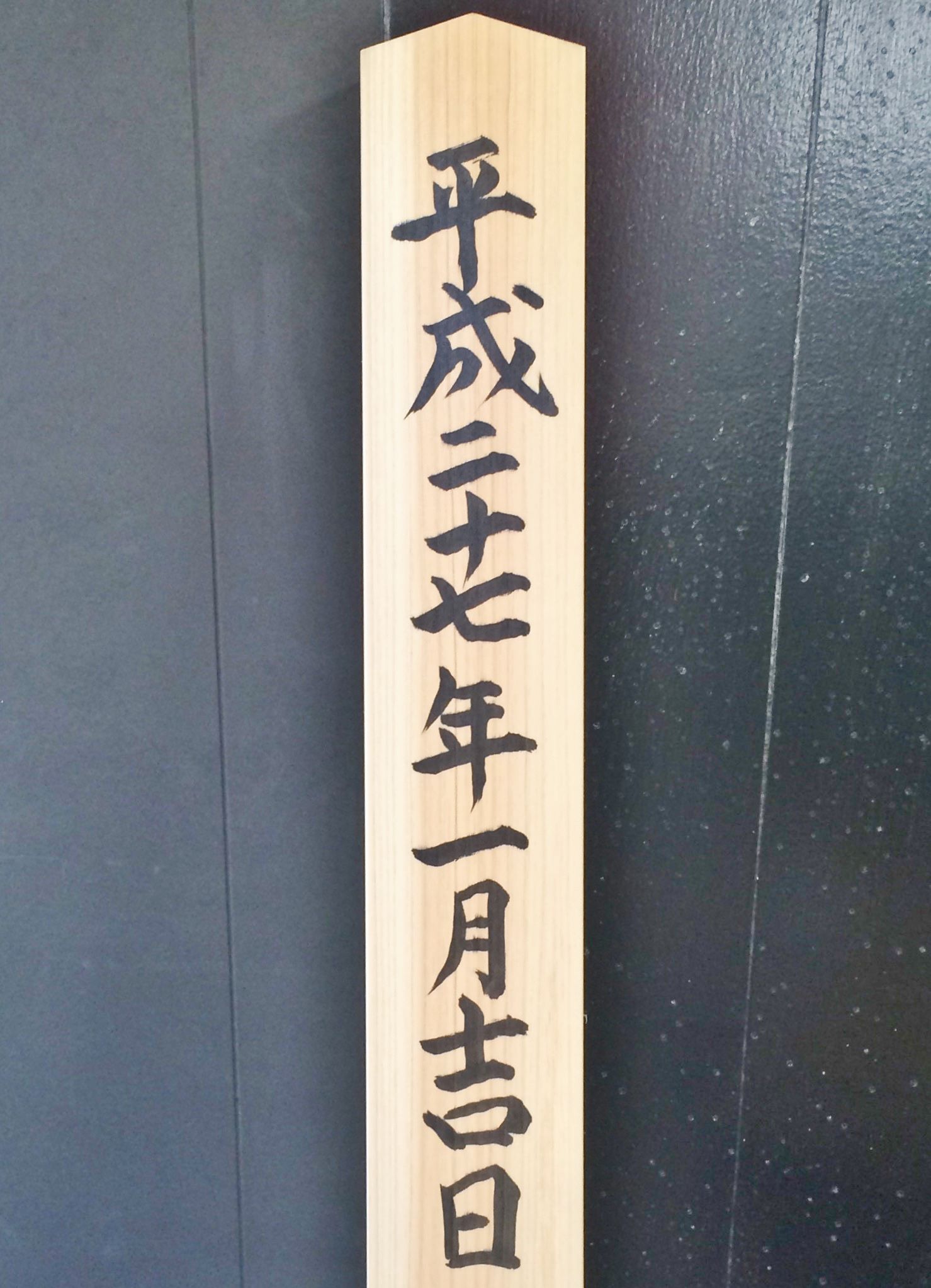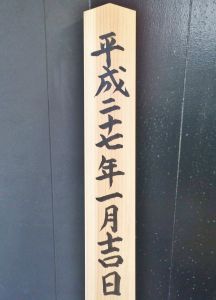 写真は、今週上棟をするお宅の御幣(ごへい)の裏側に書いた文字ですが、平成二七年一月吉日と書いているので、使わせていただきました。