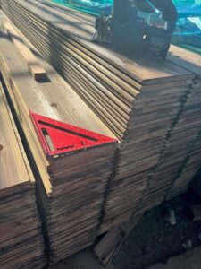職人さんが塗布した大量の杉板を大工さんが丁寧に一枚ずつはりつけていきます。
