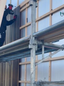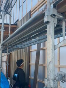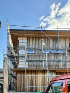 本日は木津川市にて新築中の弊社事務所の、板張り仕上げの外壁をご紹介します。