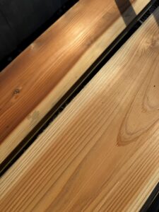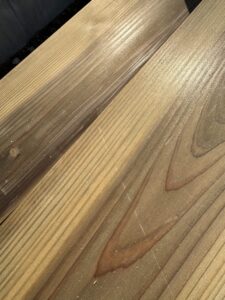 鉄焙煎仕上げとは杉板に鉄焙煎液を塗布し、杉のタンニンと反応させて自然に黒~濃茶色に発色させた仕上げ方法で、