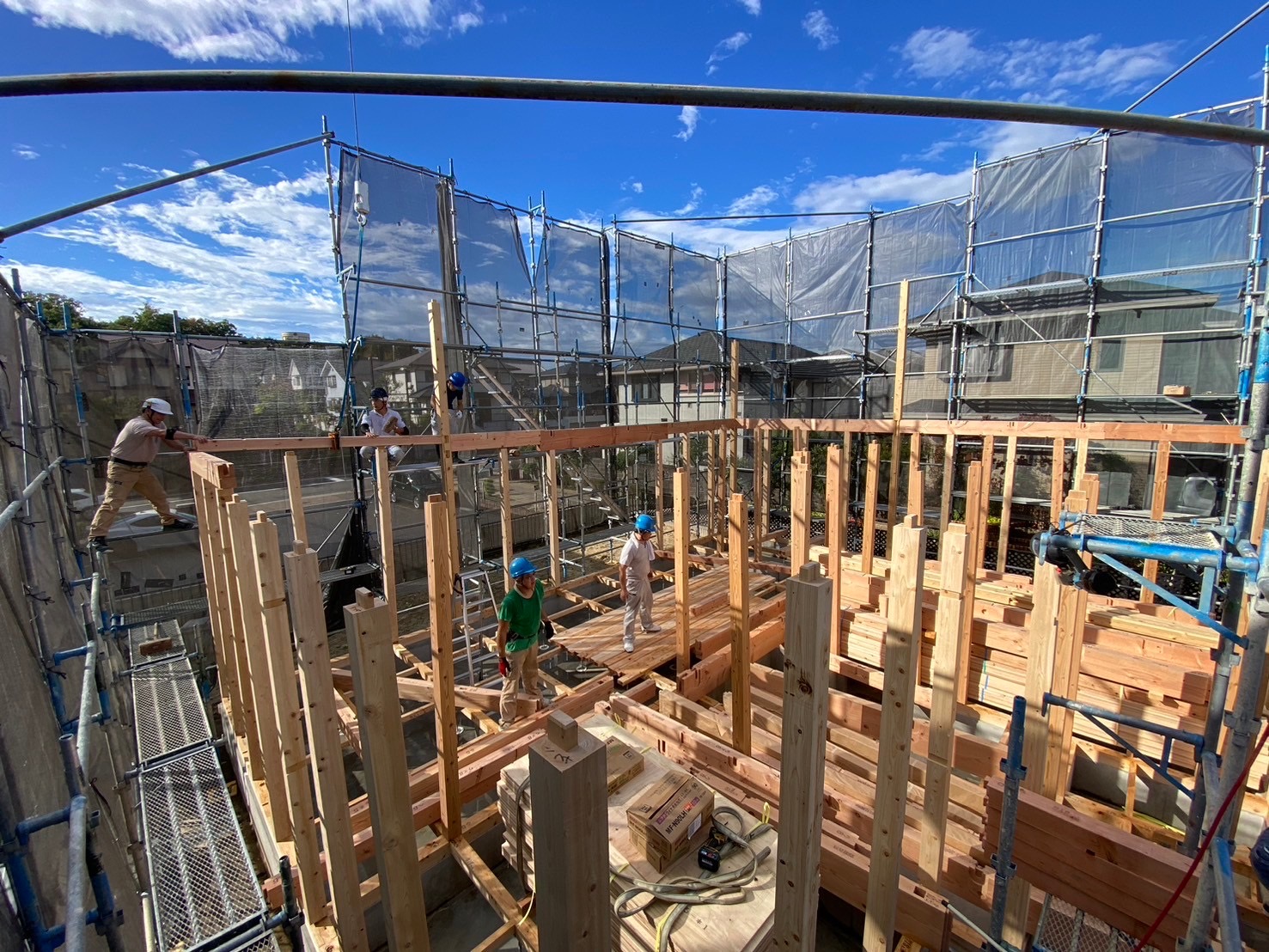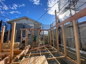 今回も大工さんのチームワークの息もぴったりで、手際の良い作業で柱・梁・床・屋根へと