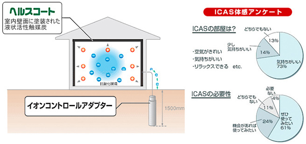 地球の磁場エネルギーと木炭の通電特性を利用し、室内をマイナスイオンの多い環境に保つシステム。ICASにより整えられた空気環境の中で過ごすことにより、高血圧・高血糖・高乳酸などが改善されるほか、NK細胞が活性化し、癌を抑制する効果があるともいわれています。