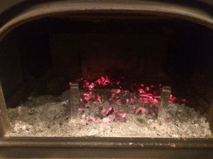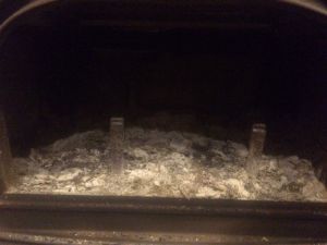 朝起きてきたときのストーブの内部はこんな状態。ストーブ本体は手で触っても熱くありませんが、まだ温かみは残ってます。