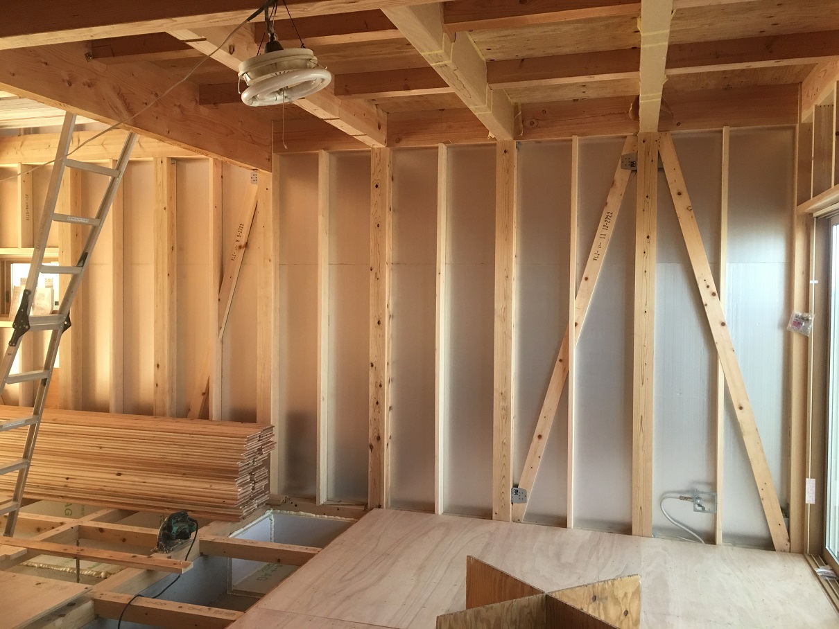 そよかぜの家では、構造用合板になるべく頼らずに、無垢の木材で耐力を確保しています。