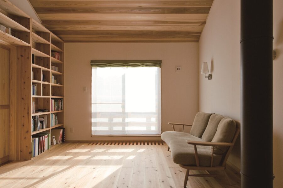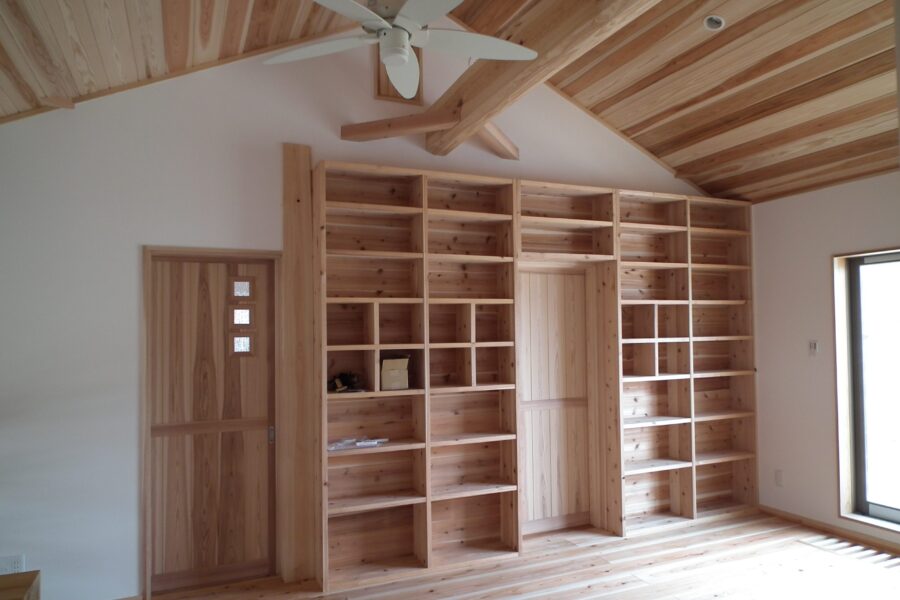 2階のフリースペースには、造作棚を作りつけてファミリーライブラリーとして活用。