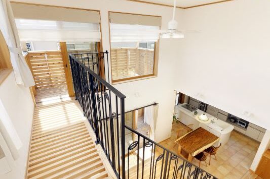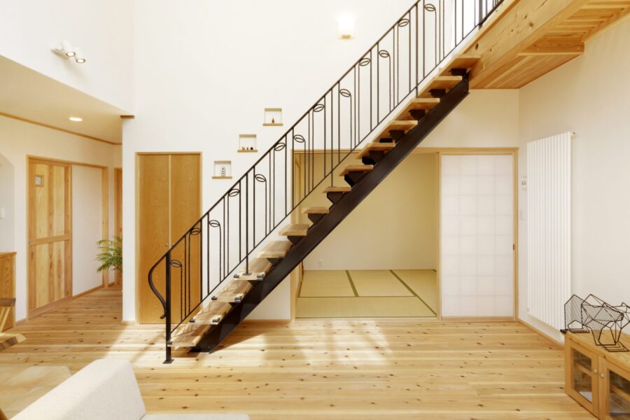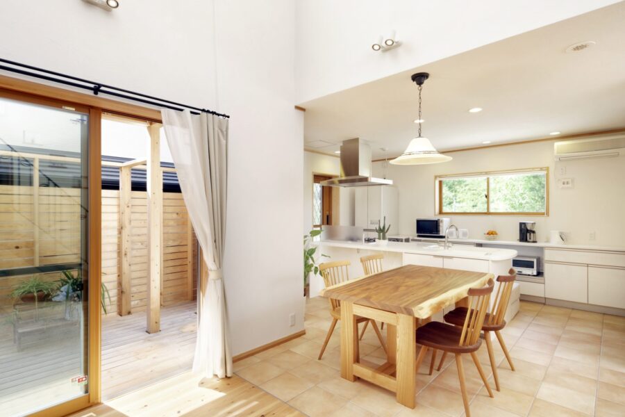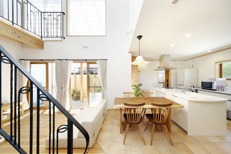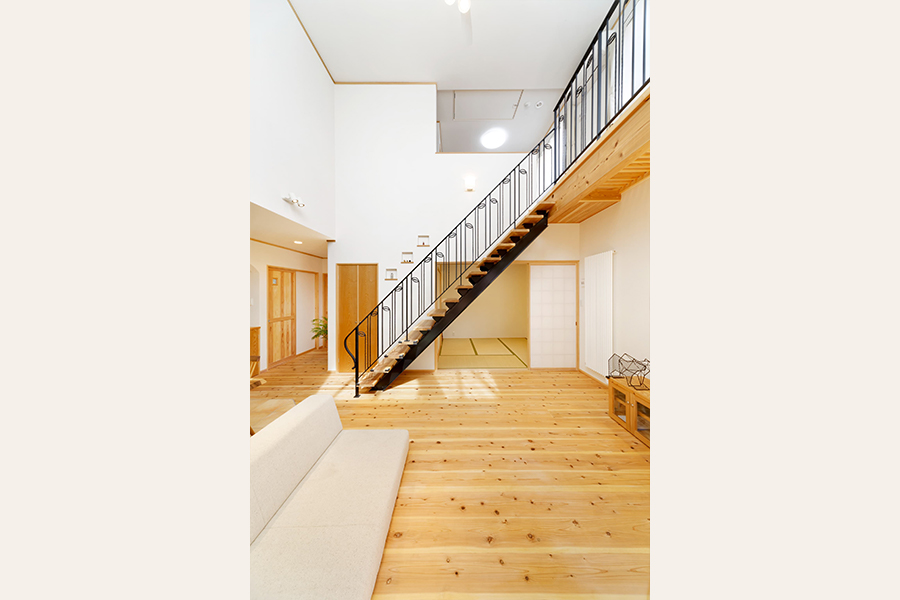 アイランドキッチンからは庭の緑が見え、階段と大きな吹抜けのあるリビングは、和室とウッドデッキとも連続し、縦にも横にも広々とした空間になりました。