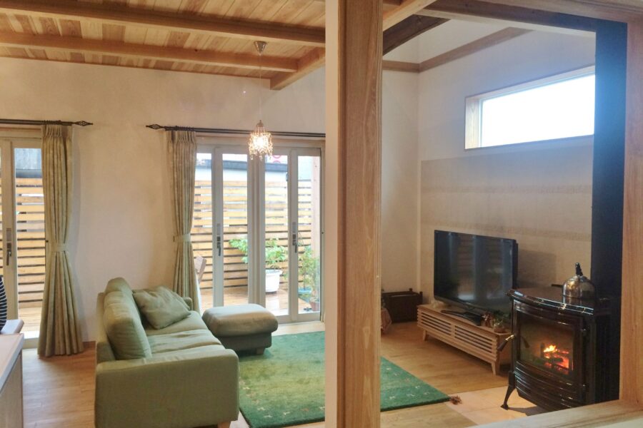 薪ストーブをLDKのどこからも見える位置に設置。美しい炎に癒されながら、暖かく過ごせます。