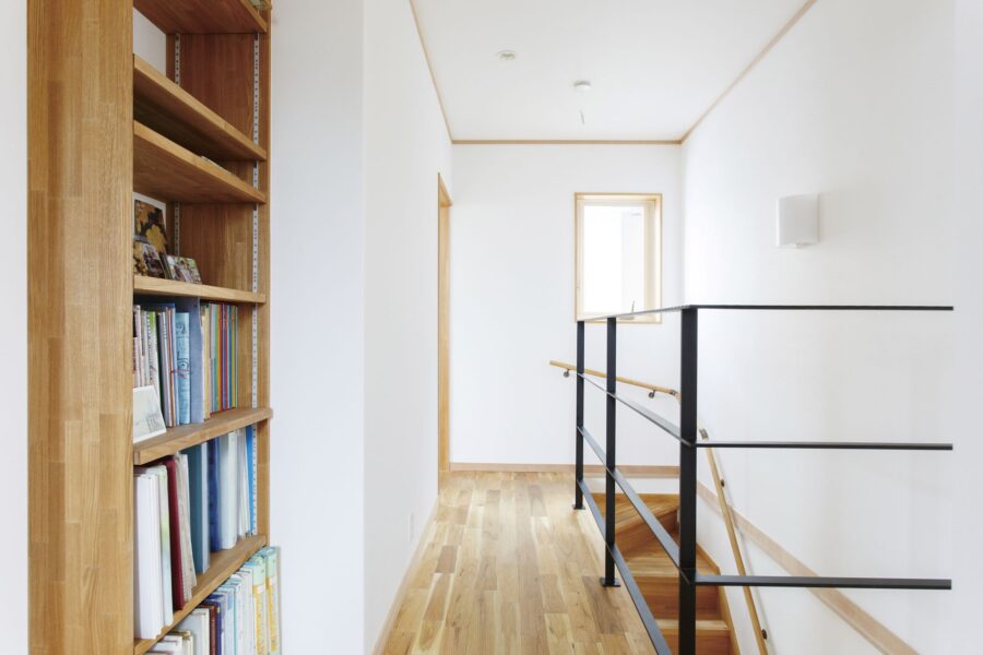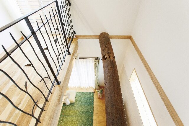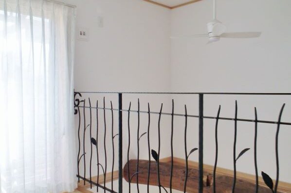 吹き抜けの手すりには味わいのあるロートアイアンを使用。柱はあえて現場で手刻みし、大工職人の技が活きる、理想としていた手仕事の温もりが感じられる住まいとなりました。