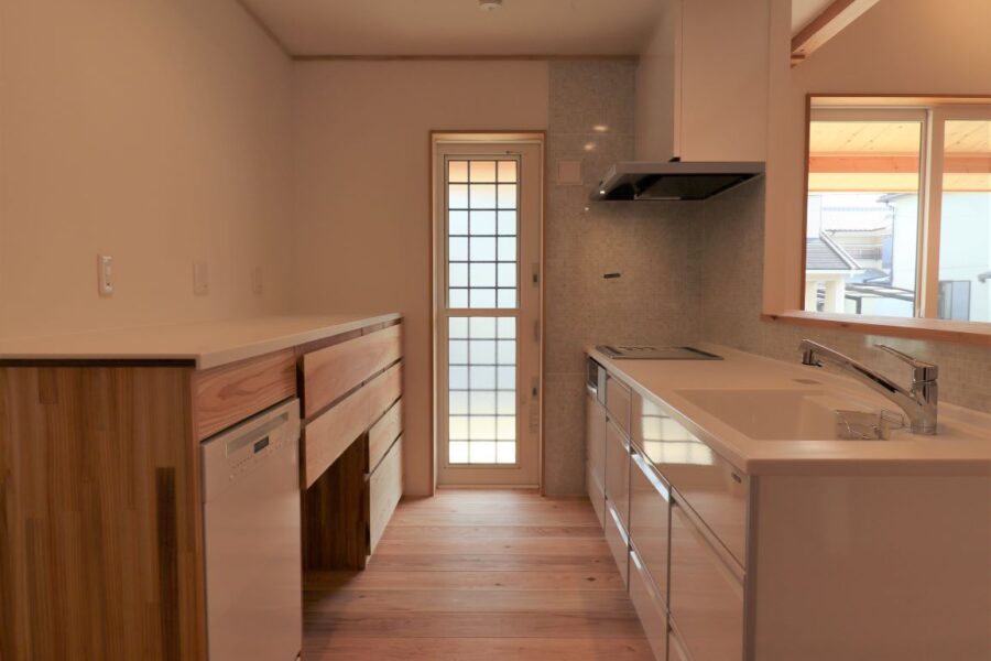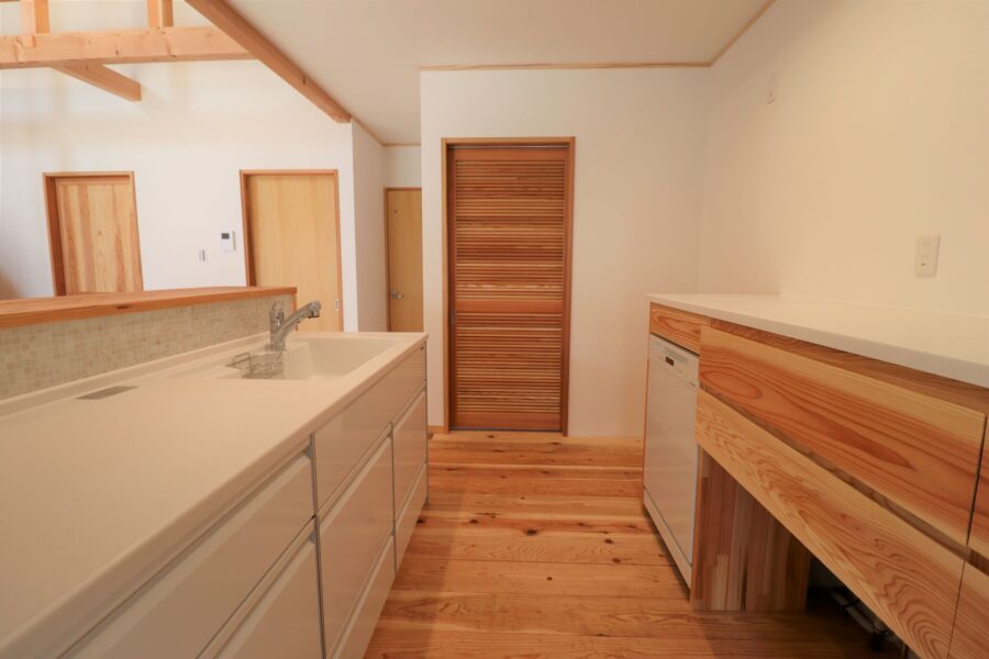 奥様こだわりのMileの食洗機を組み込んだオリジナルカップボードなど、造作家具も盛りだくさんです。