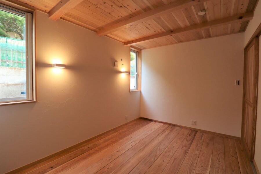 壁は漆喰塗り、床は杉の無垢材を用いて心地いい自然素材の家で