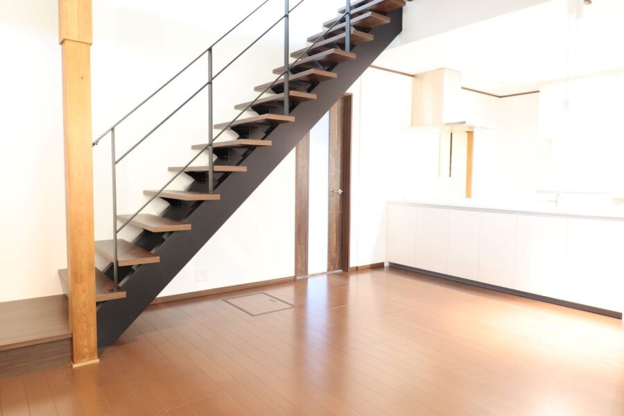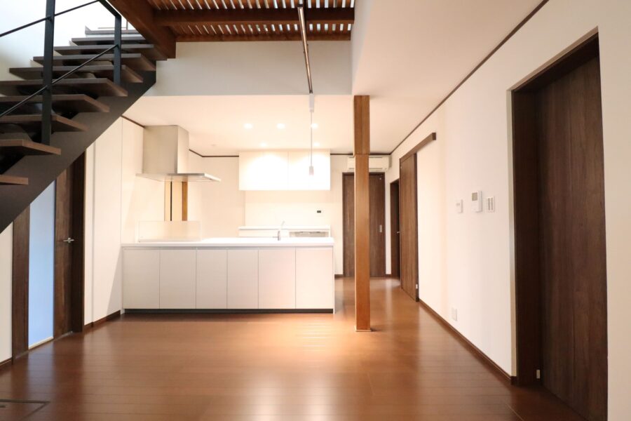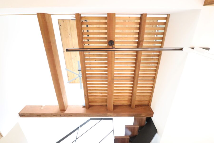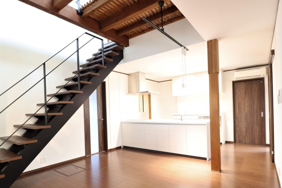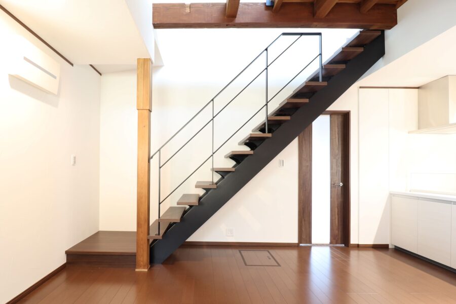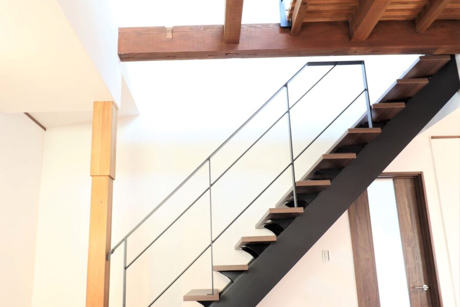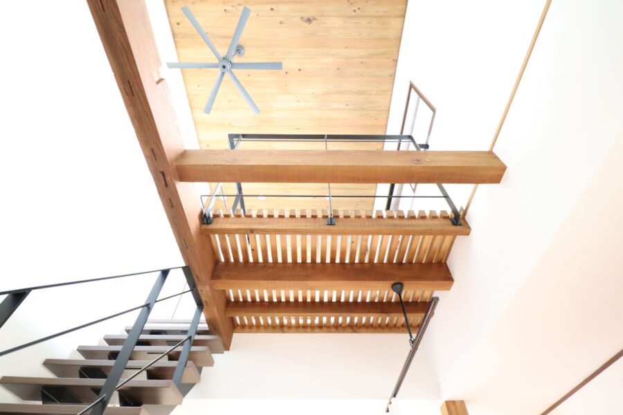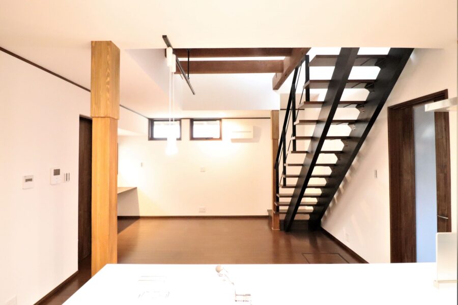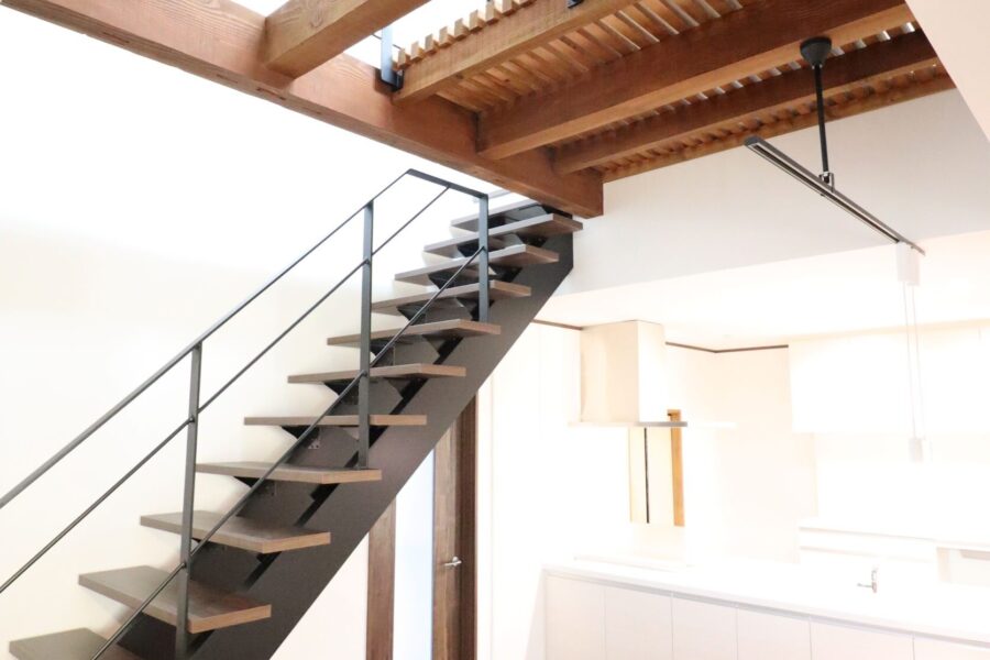 大きな梁はそのまま残して見せるデザインに仕上げ、リビングにスケルトン階段をかけ、