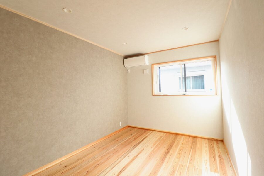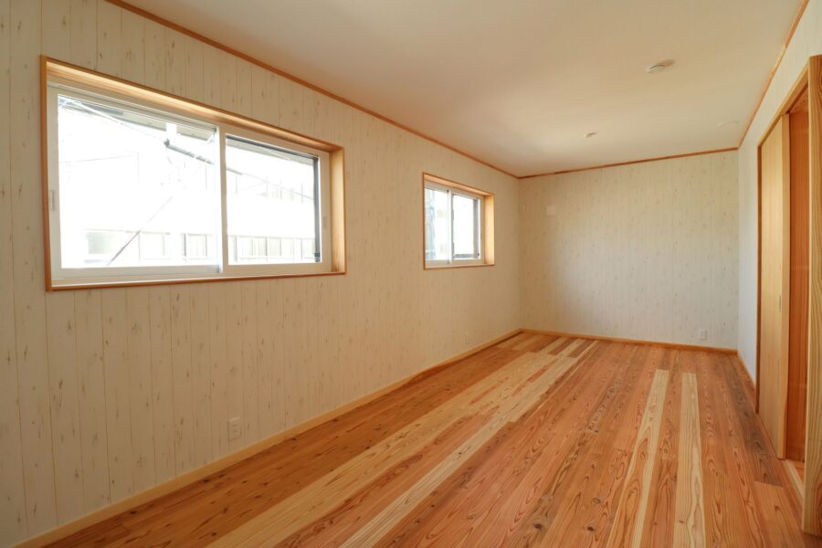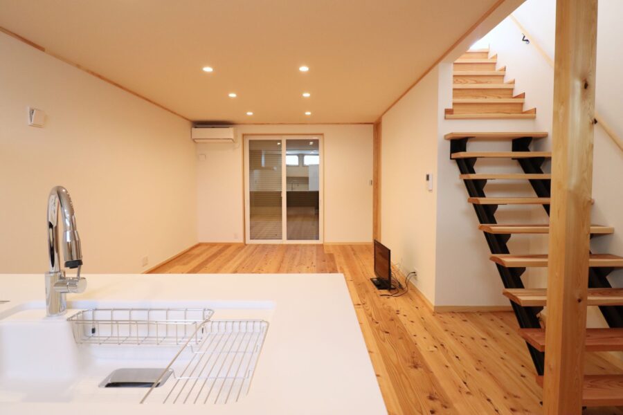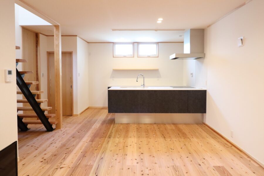 LDKはオープンな対面式キッチンで空間を広く見せ、床は杉の無垢板で仕上げ、温もりのある空間に仕上げました。
