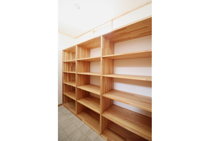 コンパクトながらもシューズクローゼットやパントリーとしても使える可動棚を備えた収納スペース、