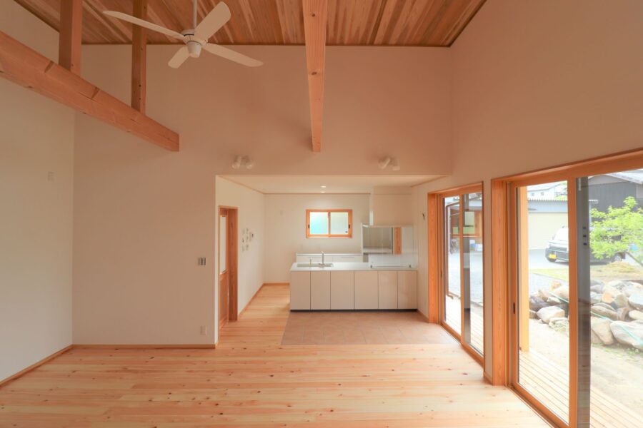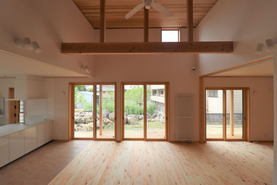リビングは平屋ならではの高い天井で広がりと明るさに満ちた空間に仕上がりました。