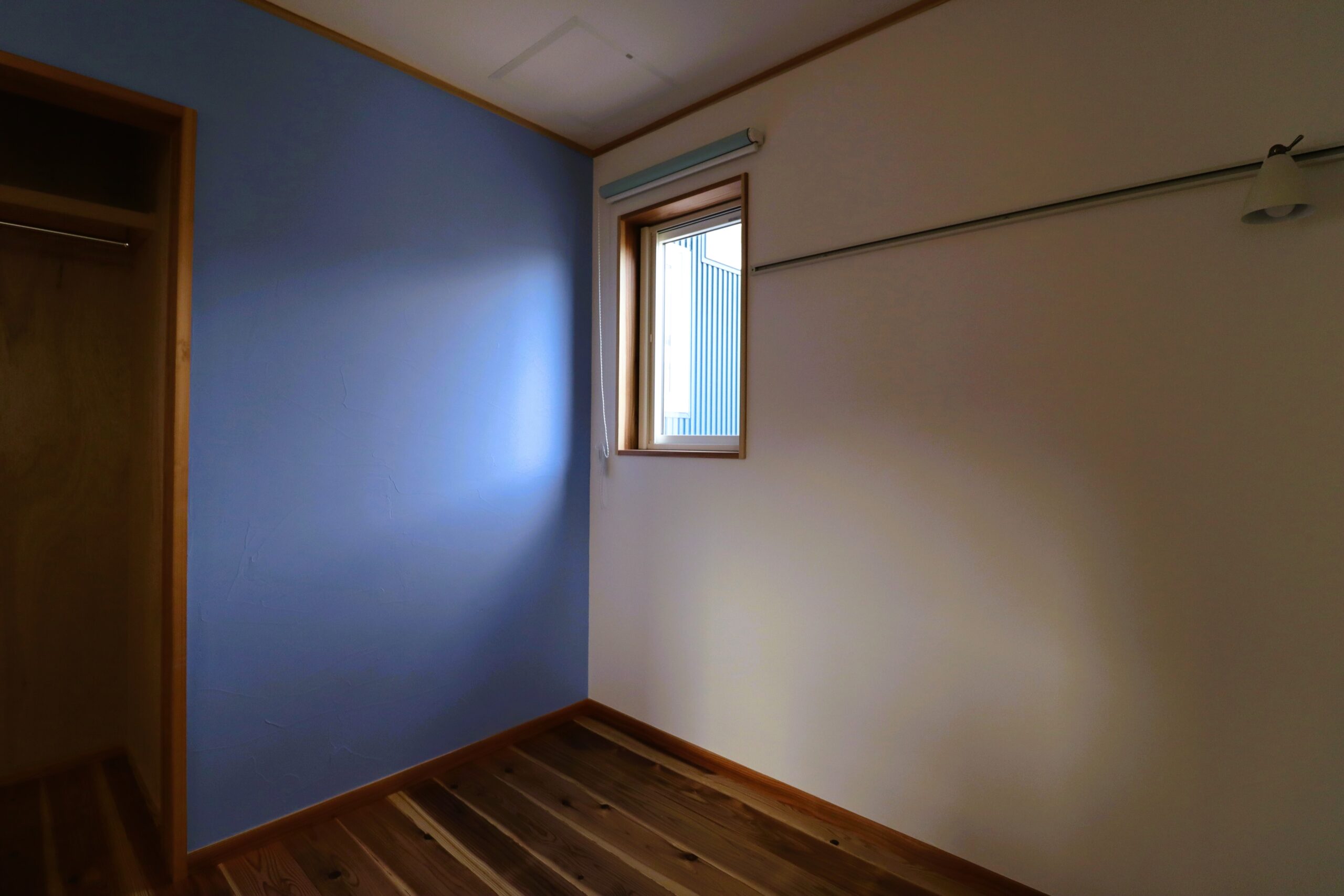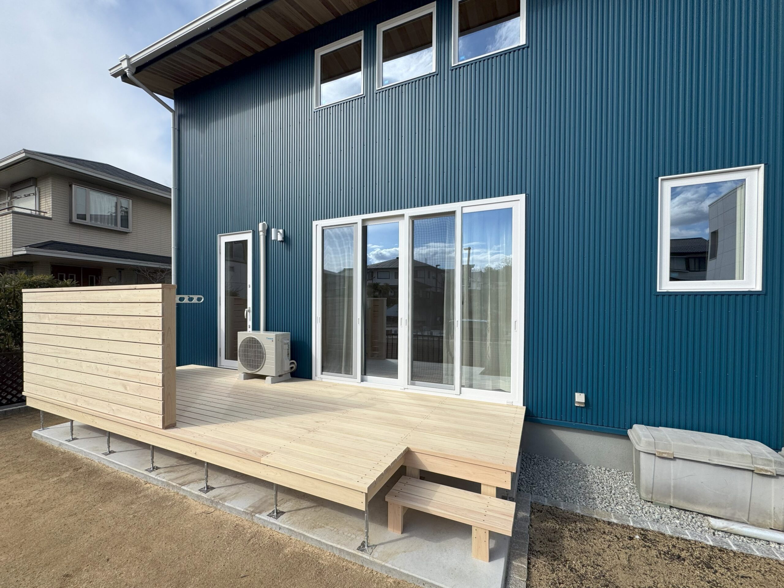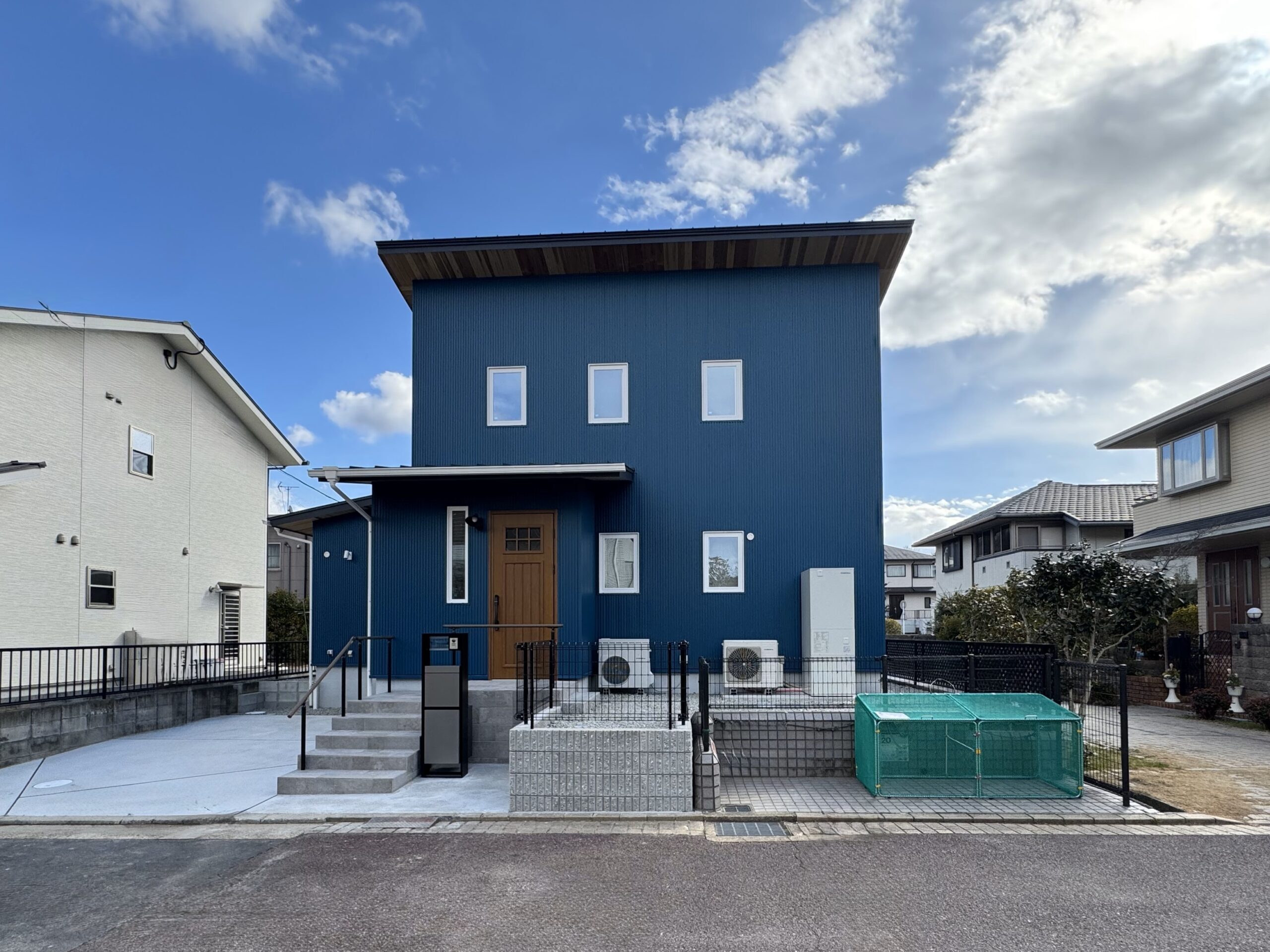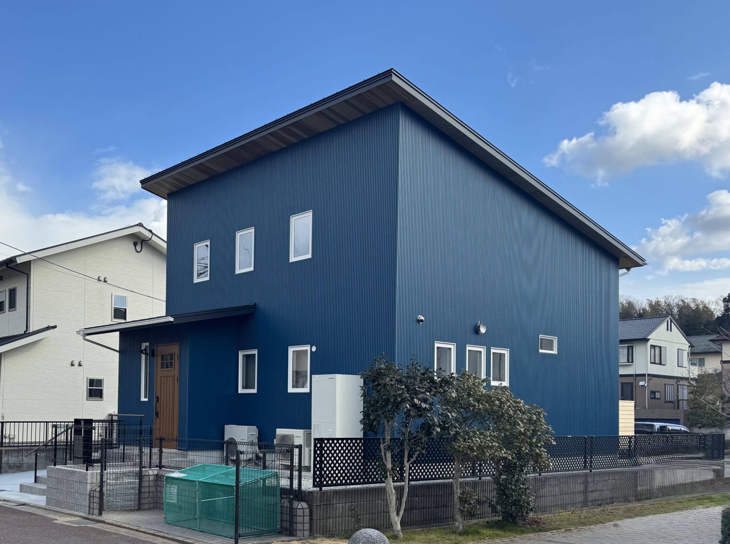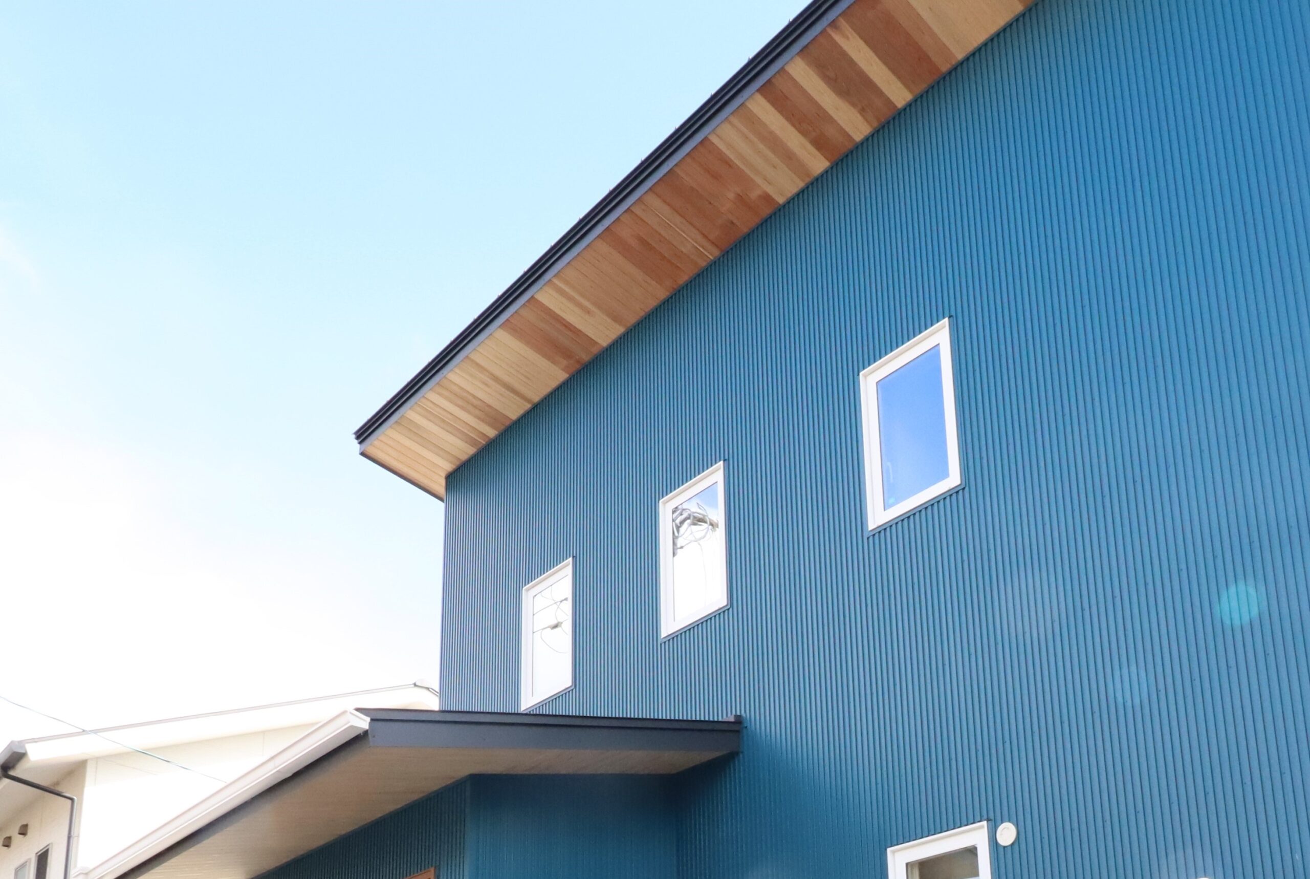 鮮やかなブルーのガルバリウムの外壁に白の窓枠と木目の軒天井が映える外観と、