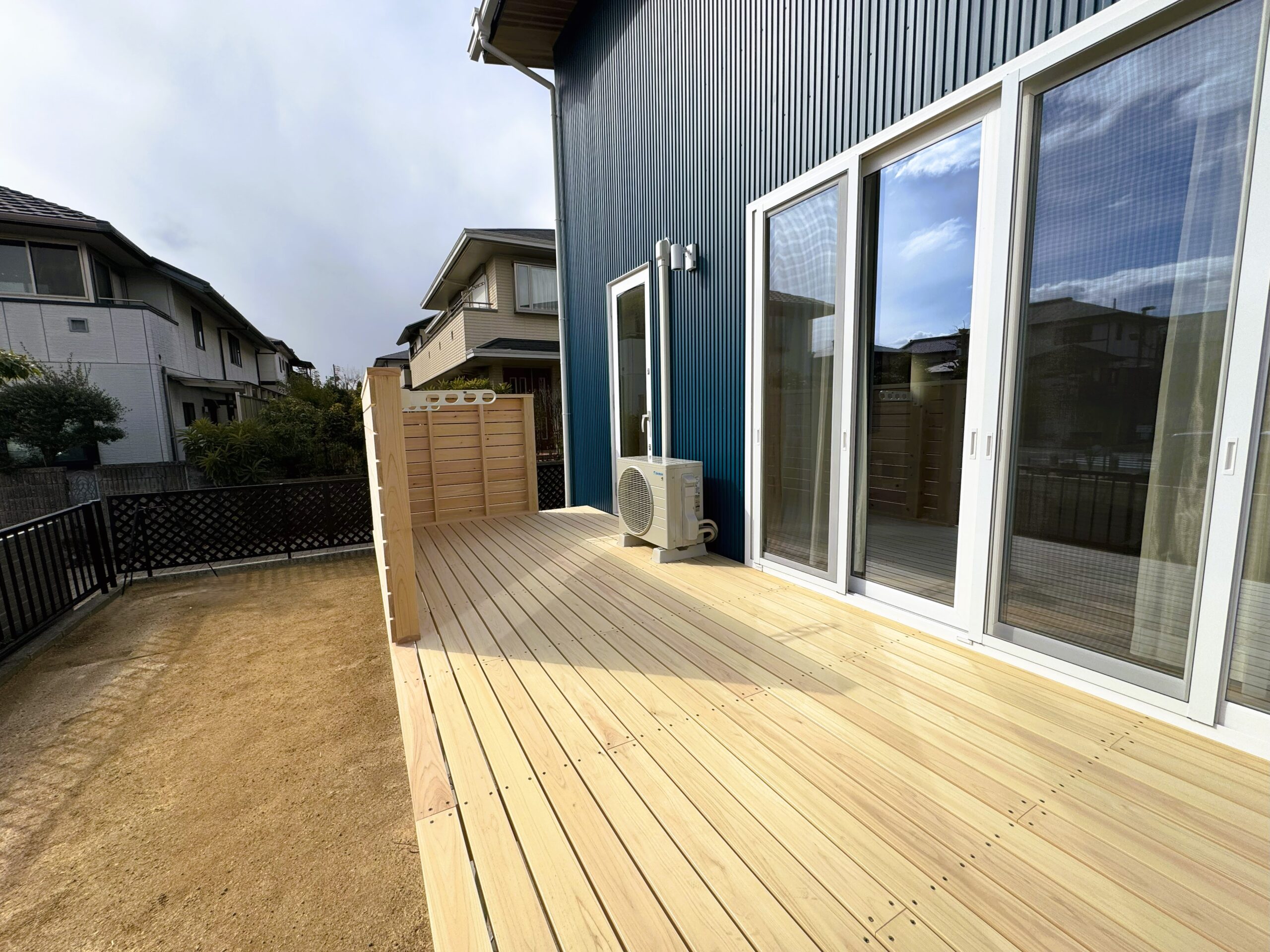 ランドリーから、物干しのウッドデッキ、ファミリークローゼットが一直線でつながる家事ラク動線も嬉しいポイント。