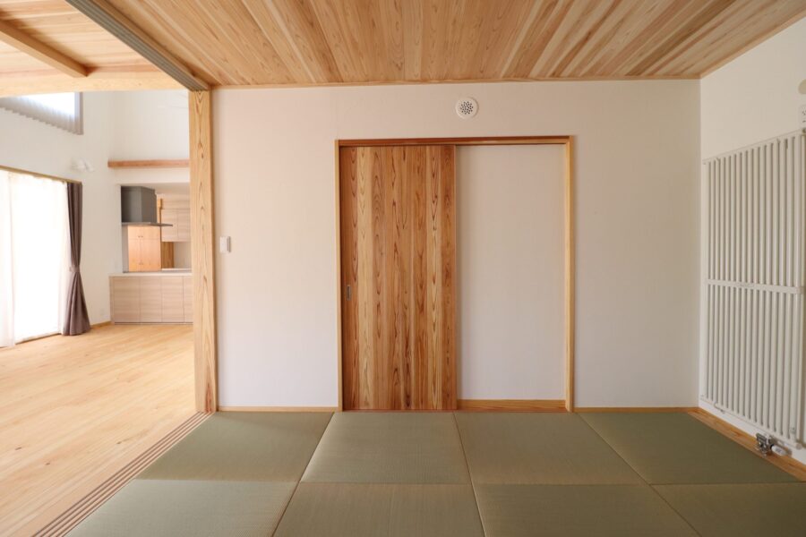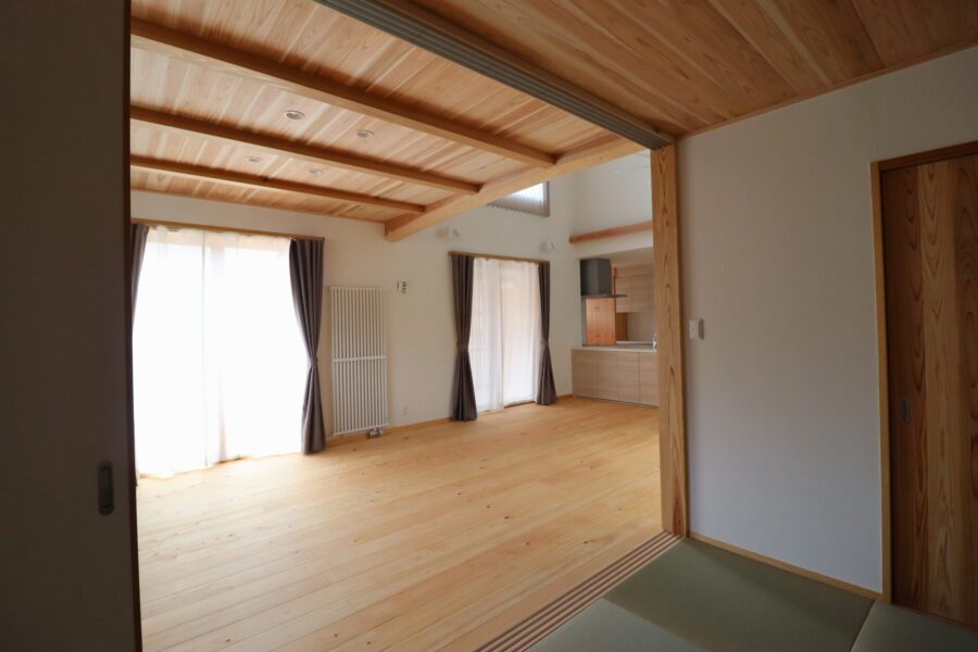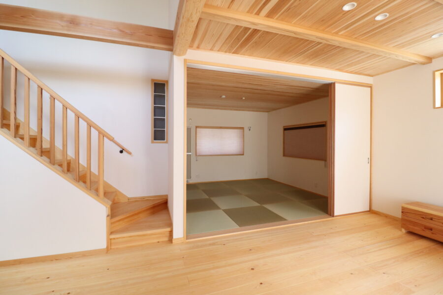 くつろぎスペースのリビングの天井は板張りにし、のんびりできる和室も続きに配置しました。