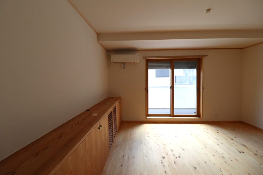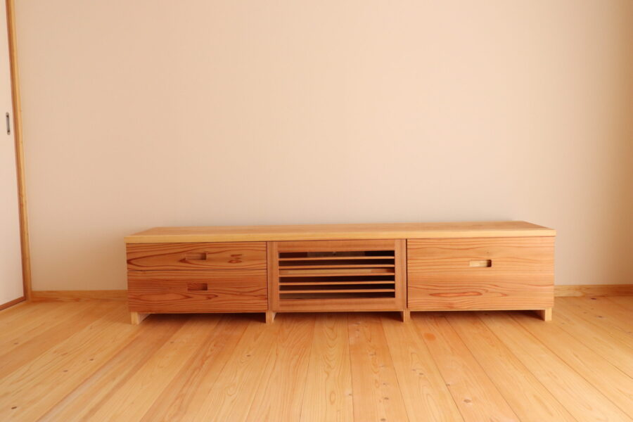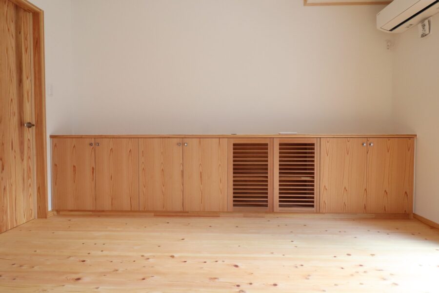 TVボードや寝室のサイドボードや書斎の本棚まで大工さんによる木の造作家具で仕上げ、無垢材の空間にもよくなじみます。