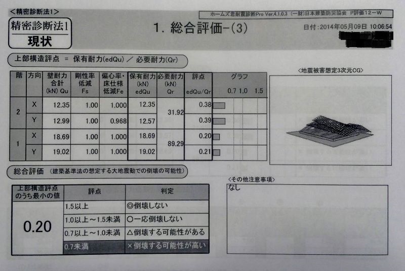 評価点が1.0以上あれば、「一応倒壊しない」、1.5以上で「倒壊しない」という風に表現されます。0.7~1.0は「倒壊する可能性がある」という表現になります。