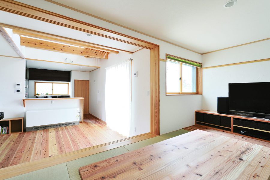 炉を備えた和室をリビングの続きにし、多目的に使うことができます。
